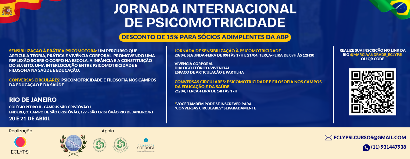 INSCRIÇÕES ABERTAS!!! XVI CONGRESSO BRASILEIRO E III CONGRESSO INTERNACIONAL DE PSICOMOTRICIDADE DA ABP.Tema: “Psicomotricidade: Ciência e Profissão na contemporaneidade.”Data: 06 a 08/11/2025.Local: Centro de Convenções Dom Pedro. Campinas-SP. Acesse o … Leia mais - IV Encontro da Curumim Psicomotricidade